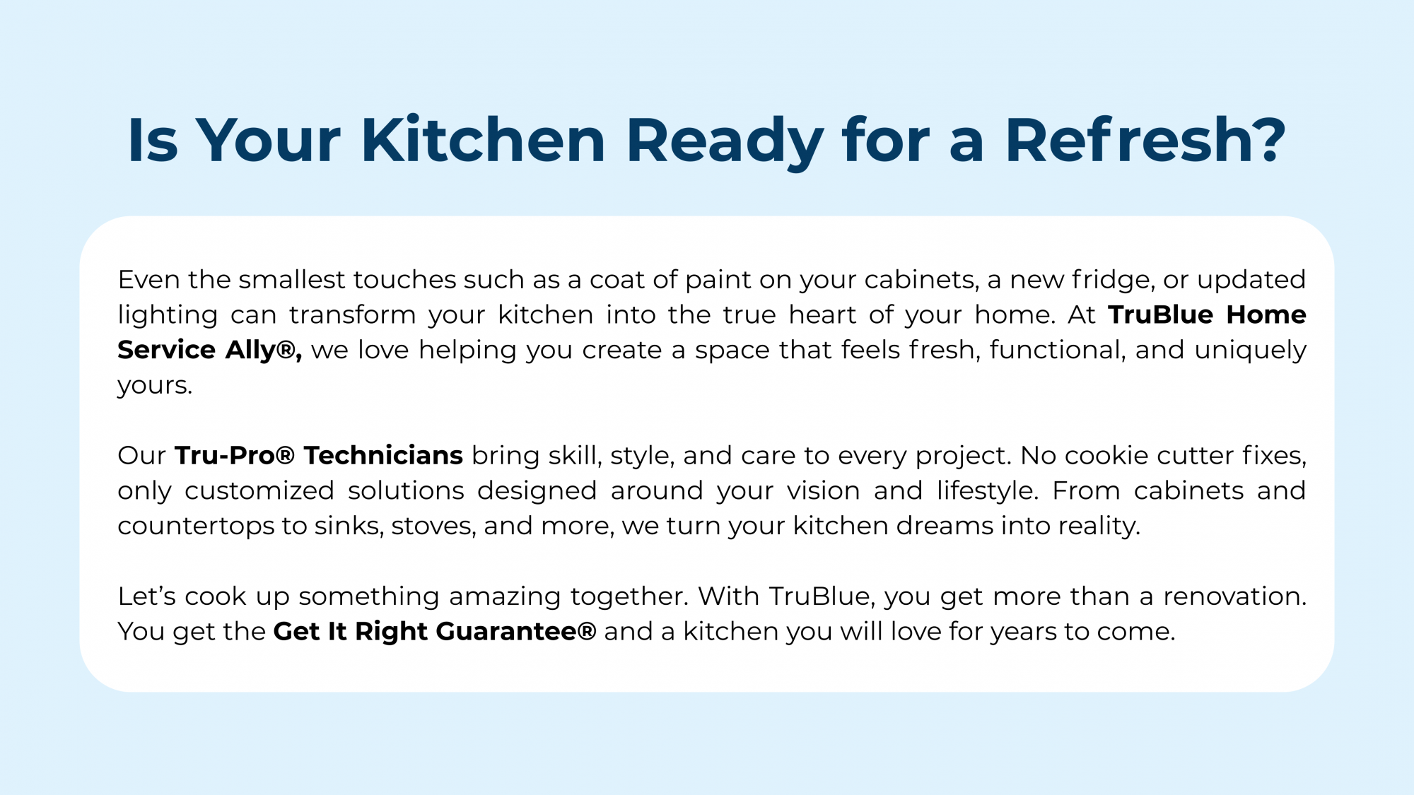 Start My Kitchen MakeoverStart My Kitchen MakeoverOur Services Handyman & Home RepairRead More To-Do List ChoresRead More BathRead More KitchenRead More Realtor ServicesRead More Seasonal WorkRead More Outside & Yard WorkRead More Deck building & repairsRead More Commercial Property MaintenanceRead More Request a QuoteA Higher Standard of Home Service Skilled, bonded, insured, and always on time. Experience the TruBlue difference with handyman and home repair services you can trust.Get a QuoteGet Franchise Info NowSee Open Territories