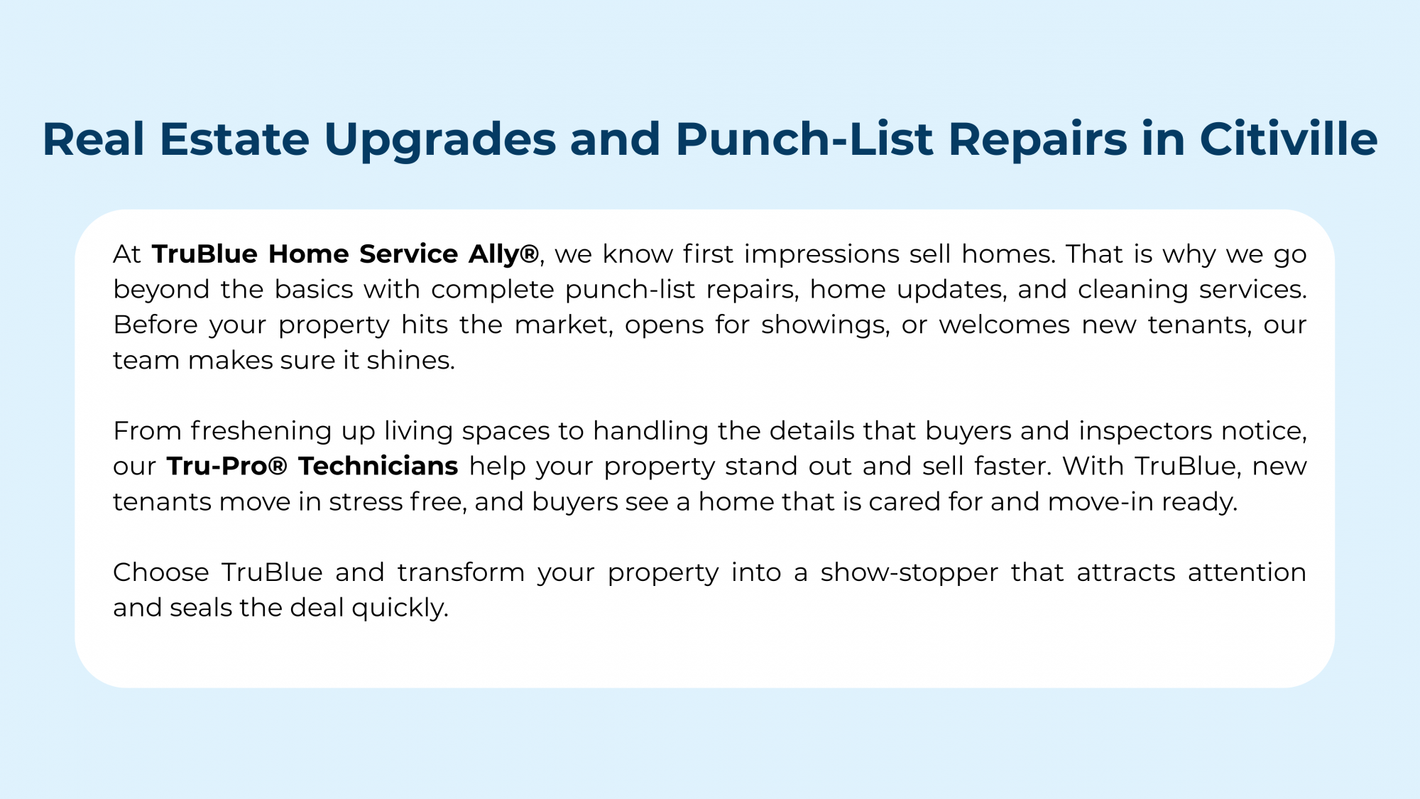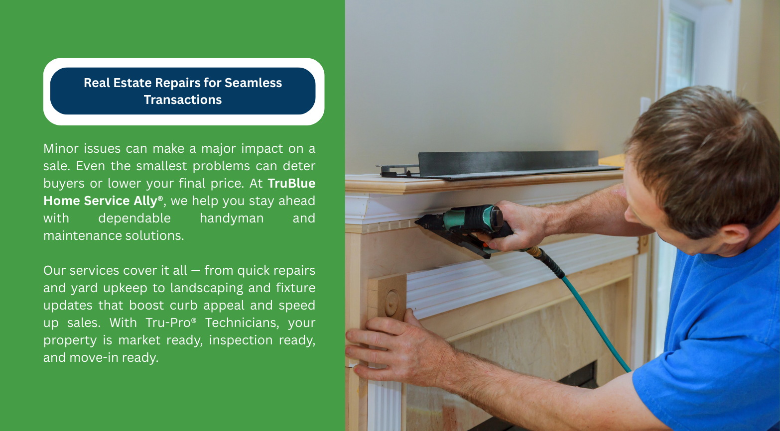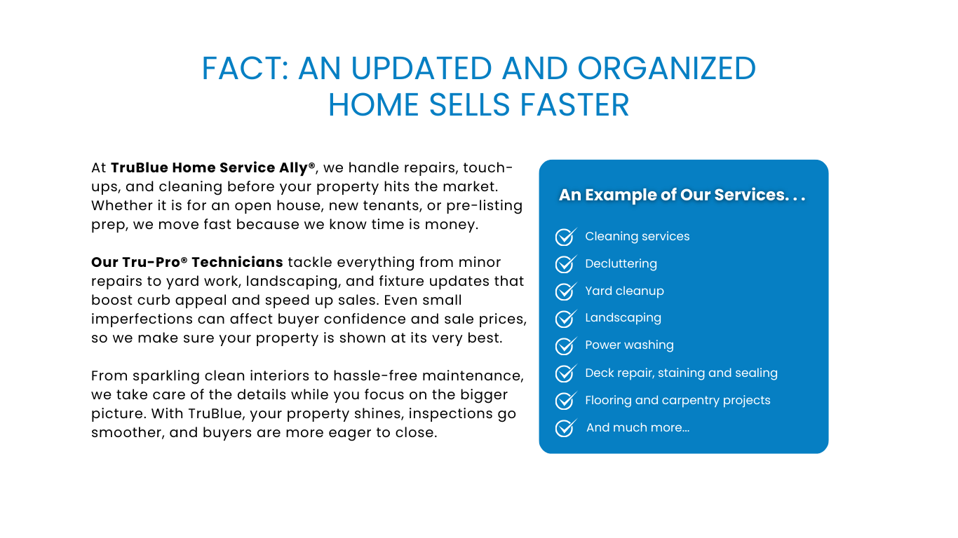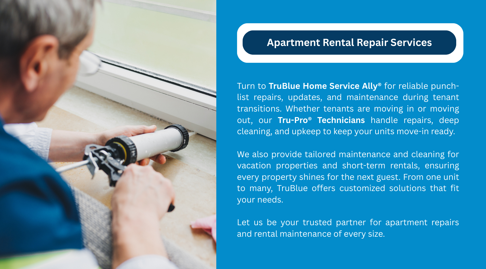 Schedule a Tru-Pro® VisitBook now Book now Our Services Handyman & Home RepairRead More To-Do List ChoresRead More BathRead More KitchenRead More Realtor ServicesRead More Seasonal WorkRead More Outside & Yard WorkRead More Deck building & repairsRead More Commercial Property MaintenanceRead More A Higher Standard of Home Service Skilled, bonded, insured, and always on time. Experience the TruBlue difference with handyman and home repair services you can trust.Get a QuoteGet Franchise Info NowSee Open Territories