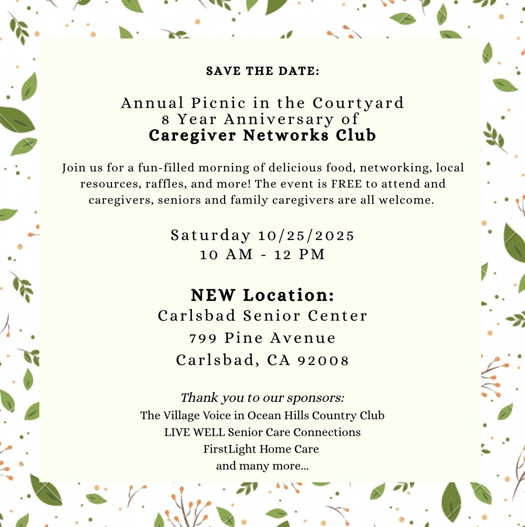 The event is free to attend, and all caregivers, seniors, and family caregivers are welcome. This celebration is made possible thanks to the support of generous sponsors, including The Village Voice in Ocean Hills Country Club, LIVE WELL Senior Care Connections, FirstLight Home Care, and many more.